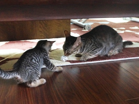 警戒心の強いママが、こんなにも「猫」っぽく遊んでくれるなんて。うれしい~。
