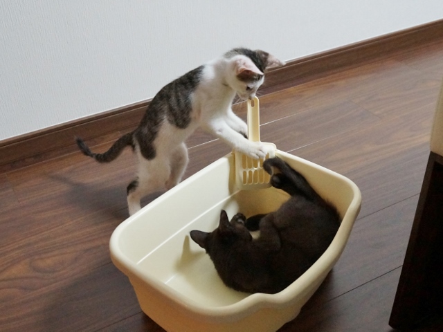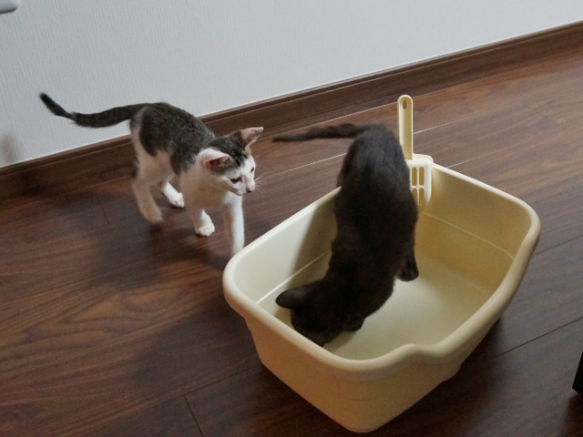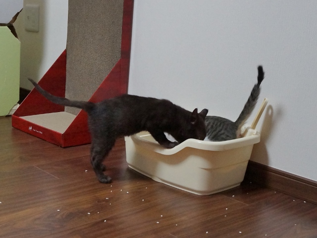 トイレを交換しようと準備していると、チェックしにくる猫たち。