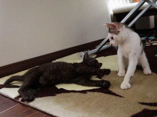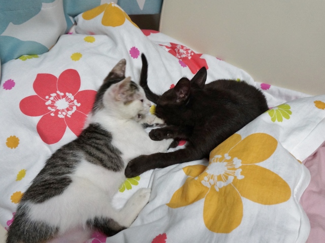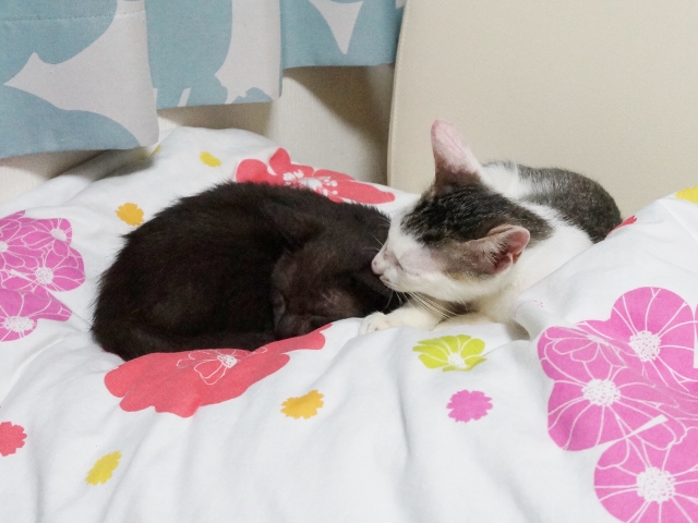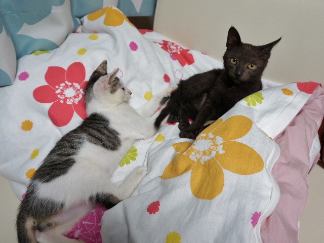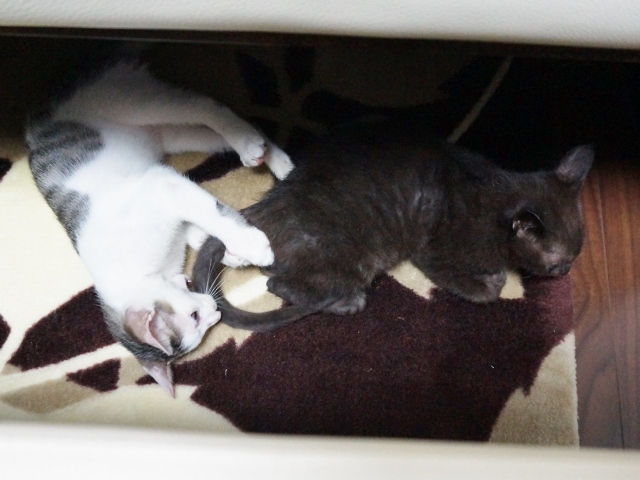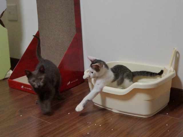 朝、ねこ部屋を見ると、いつものダンボールの中ではなく別々の場所に居た猫たち。