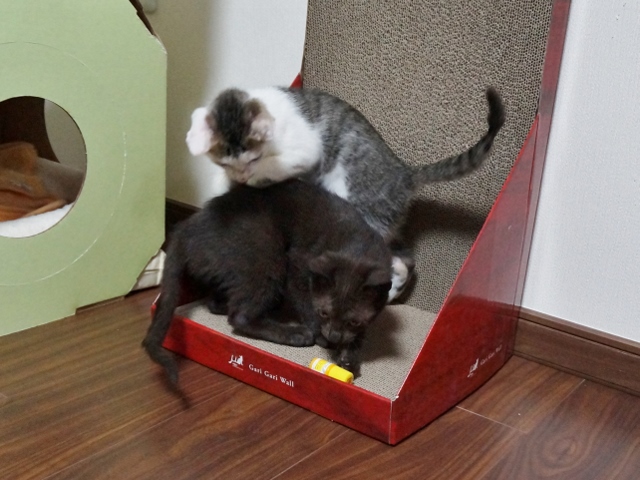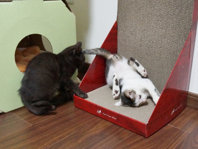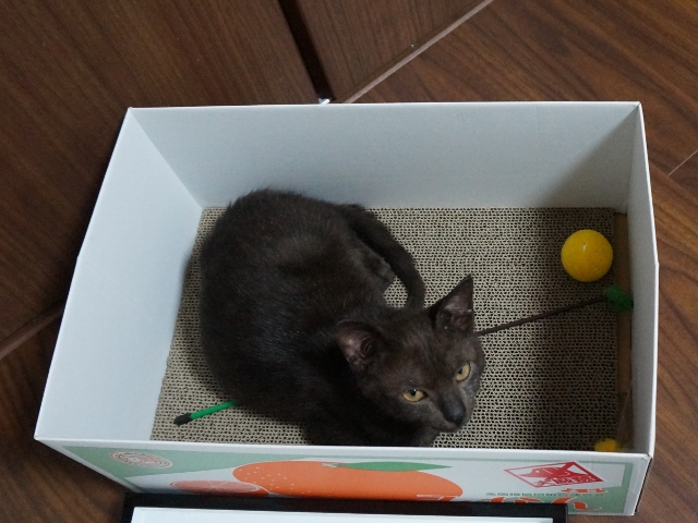 「チョコちゃん」はオモチャ箱になっている爪とぎダンボールの中。