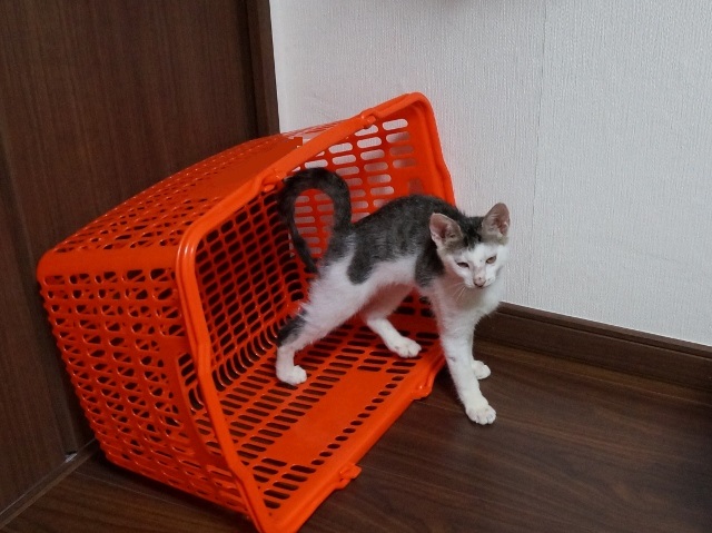 白キジ「坊ちゃん」は、猫たちの遊び場として献上した「元お菓子入れ」のカゴの中。