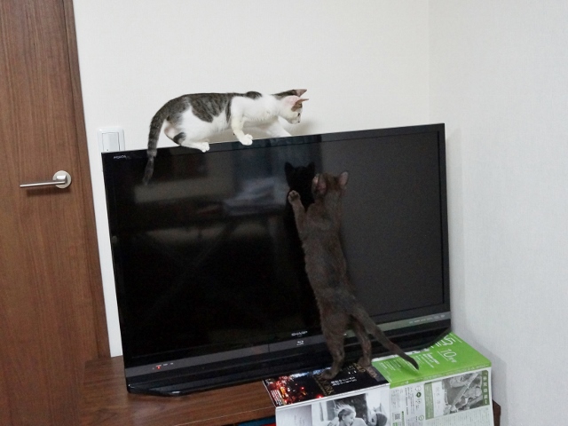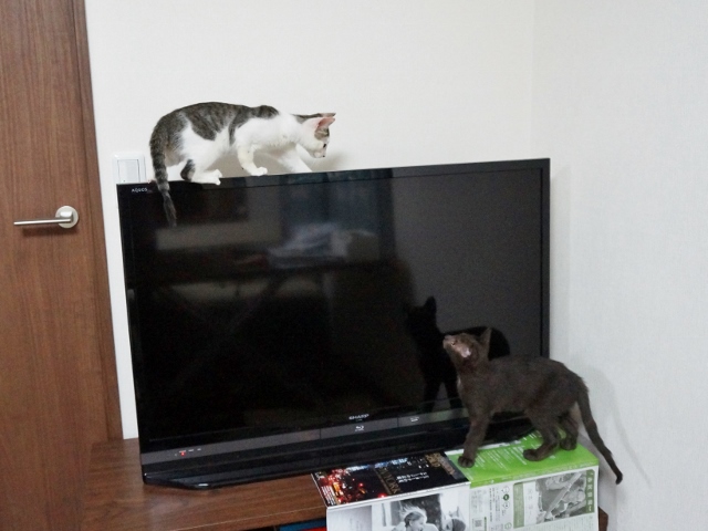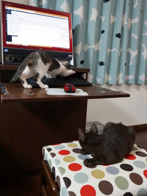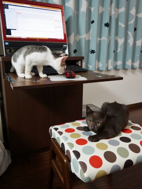 パソコン机に興味を持ち出した猫たち。