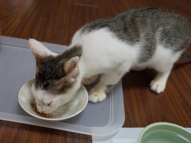 白キジ「坊ちゃん」も真菌の飲み薬入りのフードを毎日ちゃんと食べています。