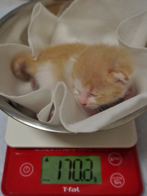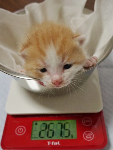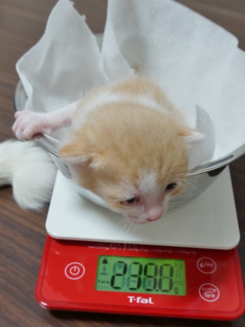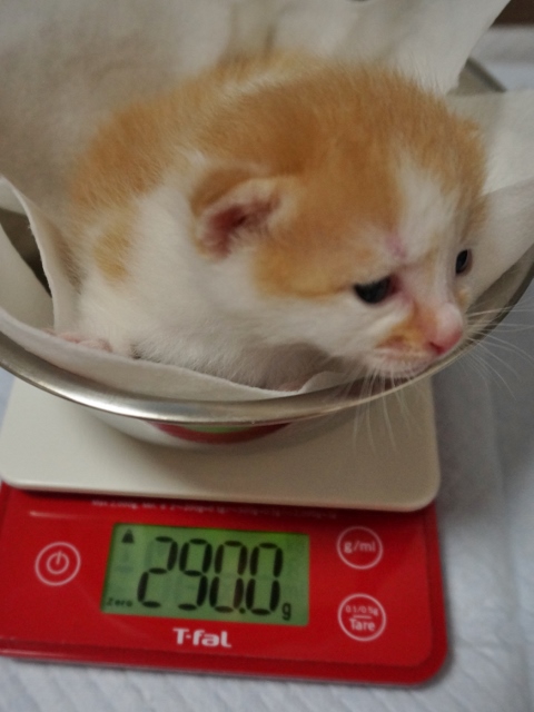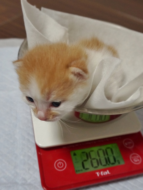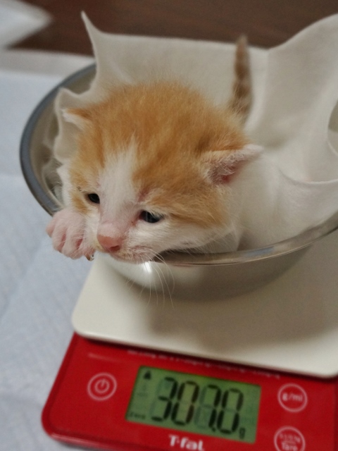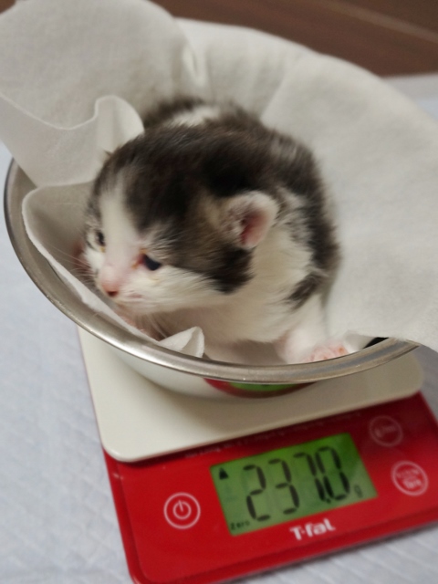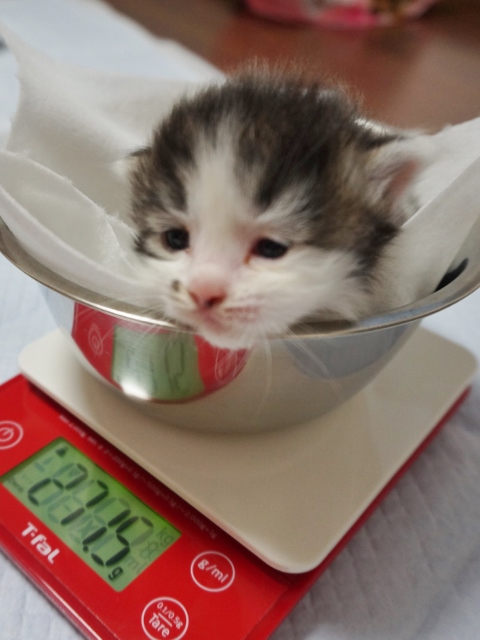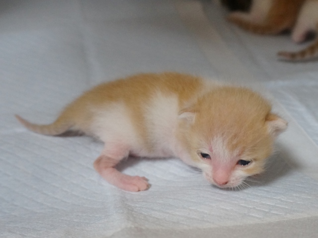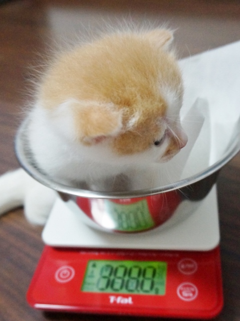 他の3匹が大きいので成長が遅れているように見えたのですが、ウチねこ「きなこ」の成長記録を読み返してみると、さほど劣っていないように思います。